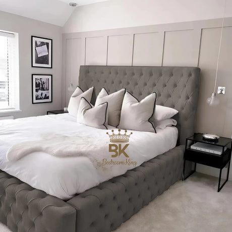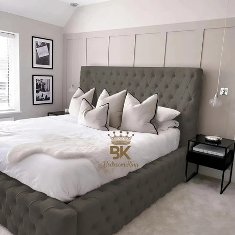 Isbah Piped Border Storage Bedframe - Grey Plush Velvet